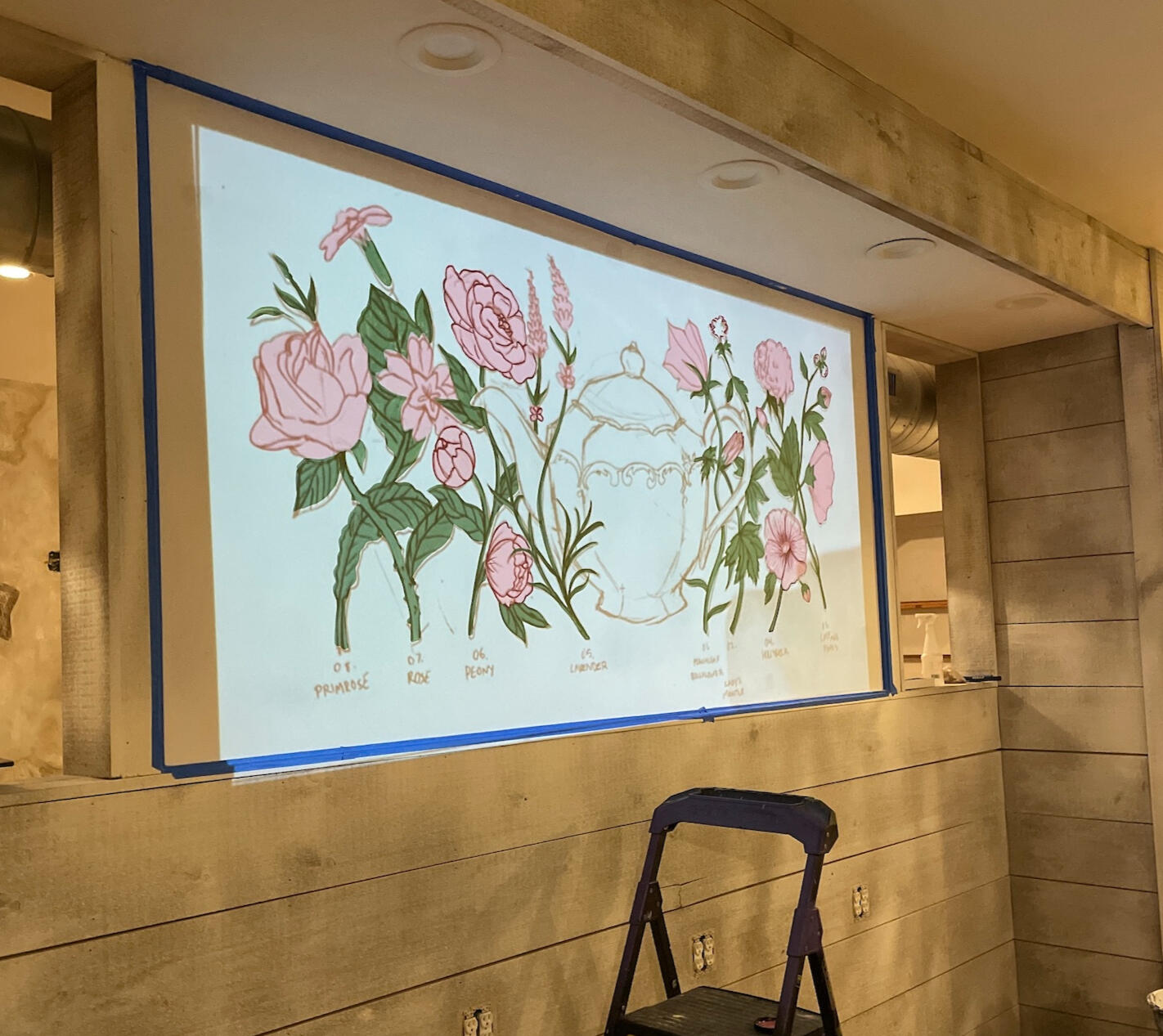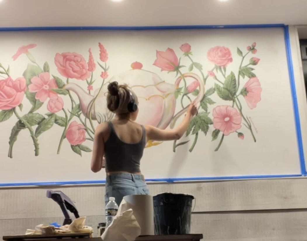 Tea Cottage Mural, house paint on drywall, 8' x 4', 2023.